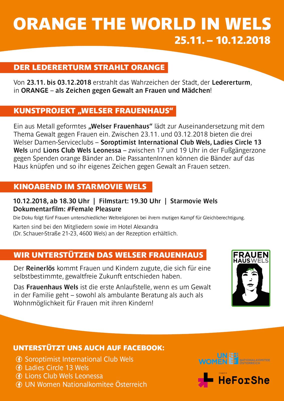 Gemeinsam mit den Damenclubs "Ladies Circle Wels" und den "Soroptiomistinnen Wels" nehmen wir heuer an der Weltweiten Aktion " ORANGE THE WORLD " gegen Gewalt an Frauen teil.